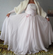 Размер 48-50. Белое, лиф украшен камнями Сваровки , корсет сзади на шнуровке, на поясе украшение- розово-белая роза ( можно снять). Есть дополнительгные 2 подъюбника. Осенне-зимний вариант- + меховая накидка.