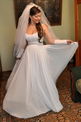 Продам изысканное свадебное платье в греческом стиле. Платье белоснежное, после чистки, в отличном состоянии. Было в использовании только 1 раз. Мой размер 38 европейский, но подойдет девушкам в большем и меньшем размере.