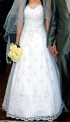 Свадебное платье фирмы "Slanovskiy", модель 9227 (размер евро 38), в отличном состоянии, надевалось на один вечер в январе 2010 года. В комплекте: корсет, украшенный вышивкой со стразами, трёхслойная юбка на кокетке с кружевом и камнями, подъюбник с кольцами, чехол для платья.